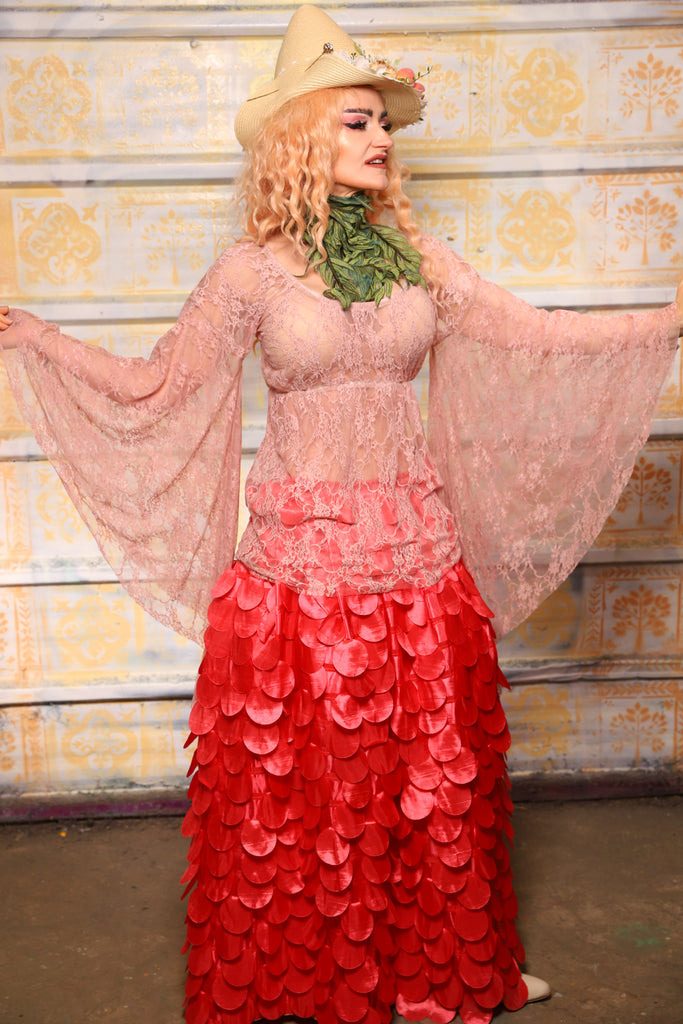Emma Blouse in w/ Goddess Sleeves in Soft Pink Lace - The "Peony Petals" Collection