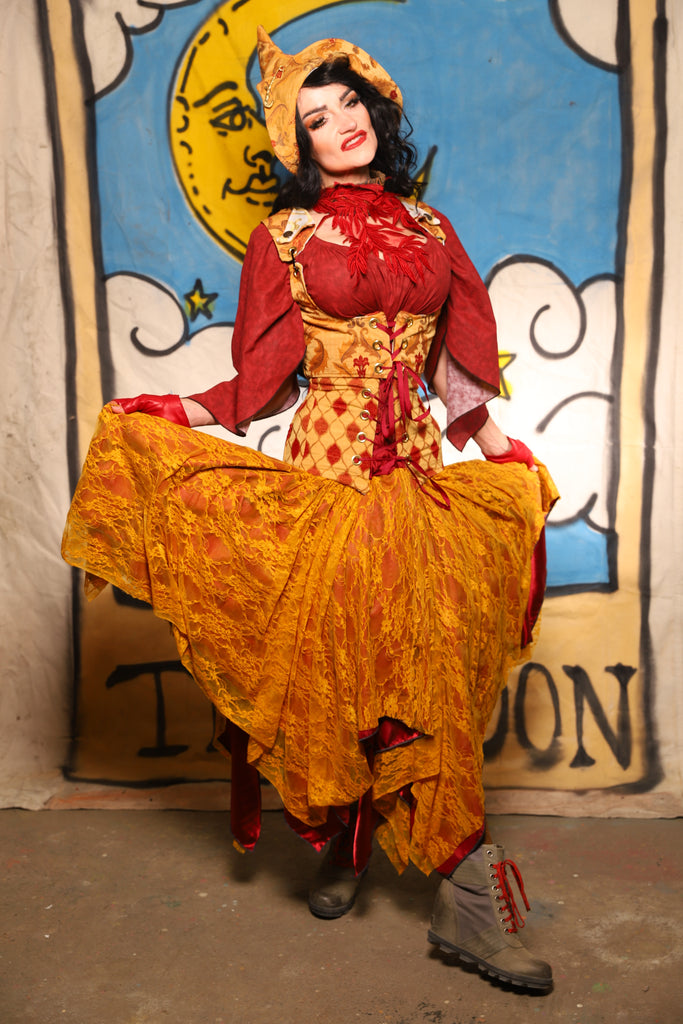 Double Layer Fairy Skirt in Scarlet Crepe Back Satin with Golden Rod Lace - The Goldenberry Collection