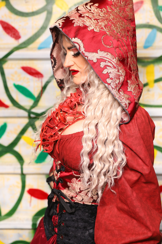 Hooded Cropped Vixen Corset in Cranberry Damask - "Crows & Cardinal Collection"