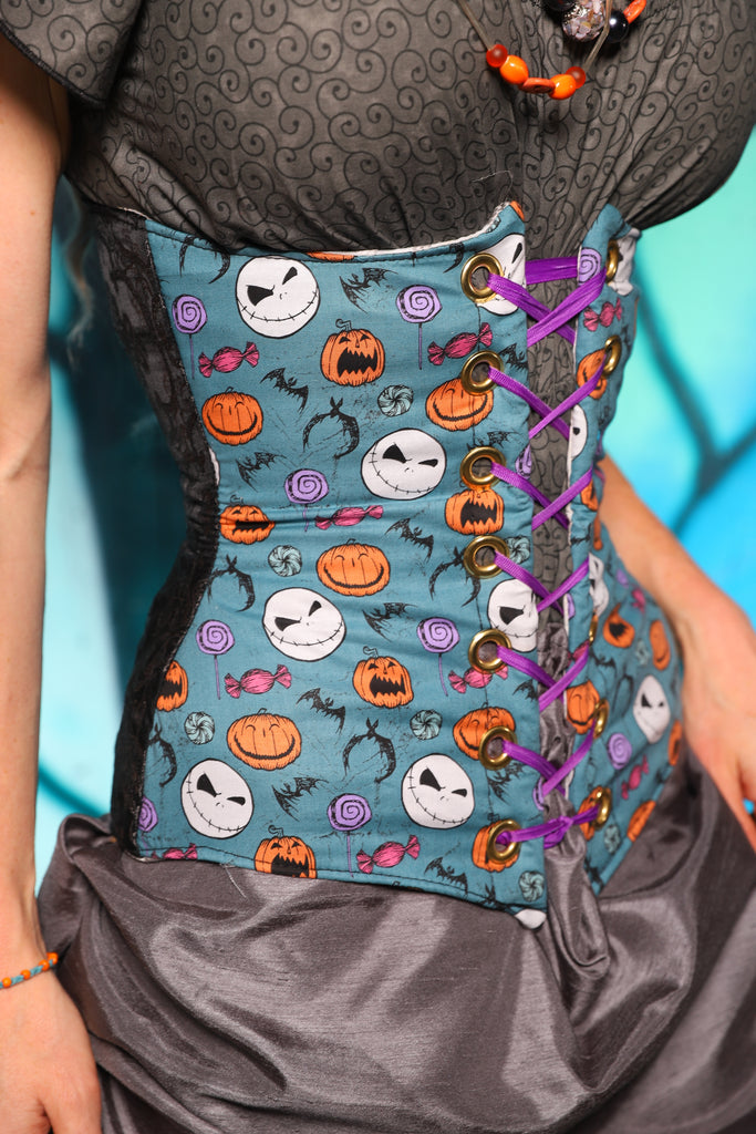 Wench Corset in Black Filigree Jacquard w/ Nightmare Before Christmas Blue Panel - The "Pumpkins, Screams & Corset Dreams" Collection