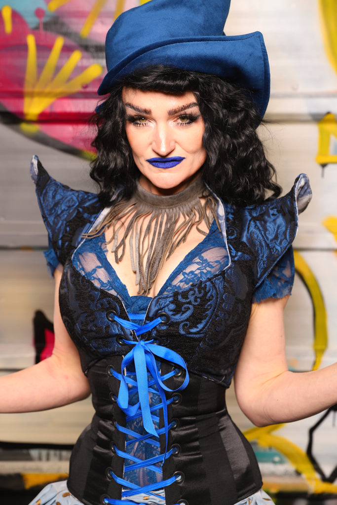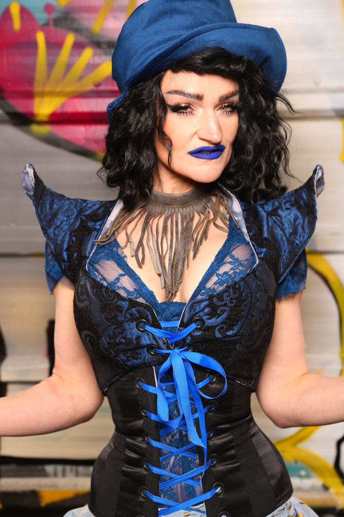 10. Cropped Faerie Overbust in Black and Blue Medallion *Please Order by BUST measurement!* - The Dark Waters Collection