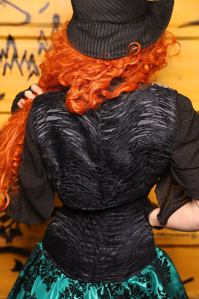 21. Lace Up Vest in Black Tendrils w/Front Panels in Dancing Skeleton - The Parlay and Promenade Collection