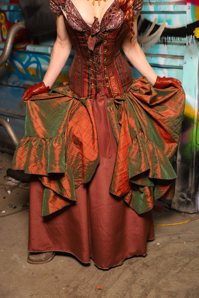 27. Split Front Skirt w/ruffle in Two Tone Tangerine & Green Pintuck - The "Ensembled in Embers" Collection