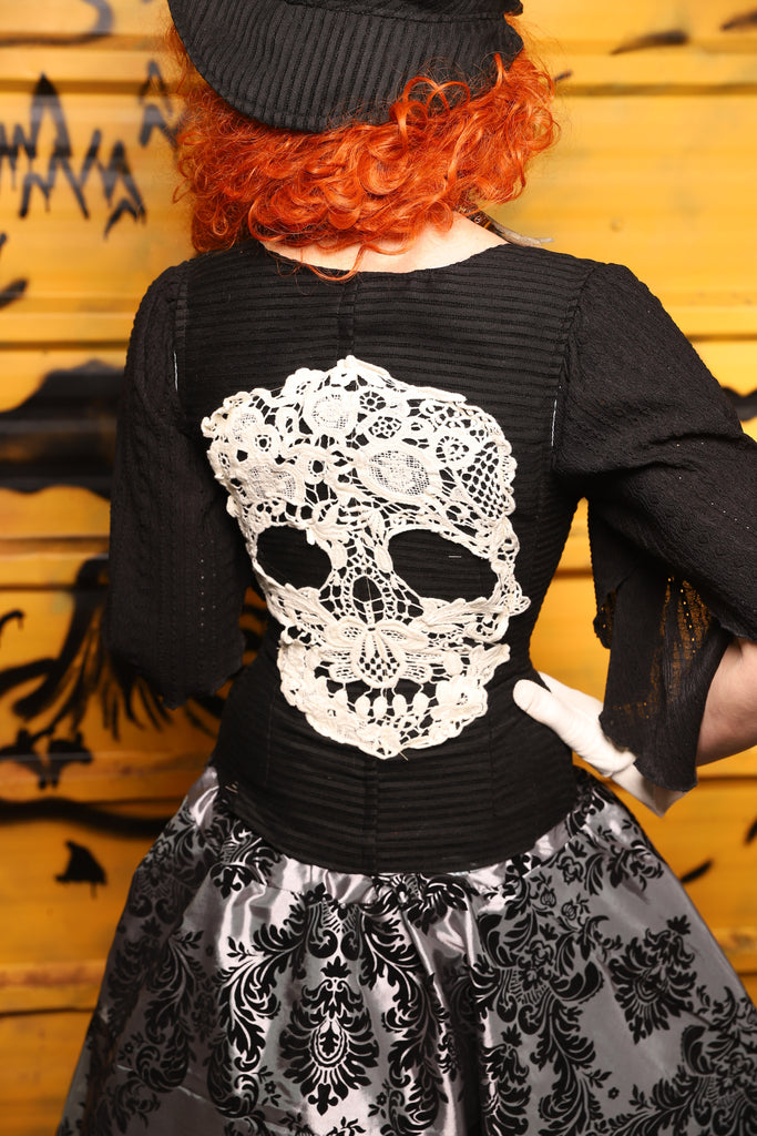 29. Petite Vixen Corset in Corded Black w/Lace Skull Applique - The Parlay and Promenade Collection