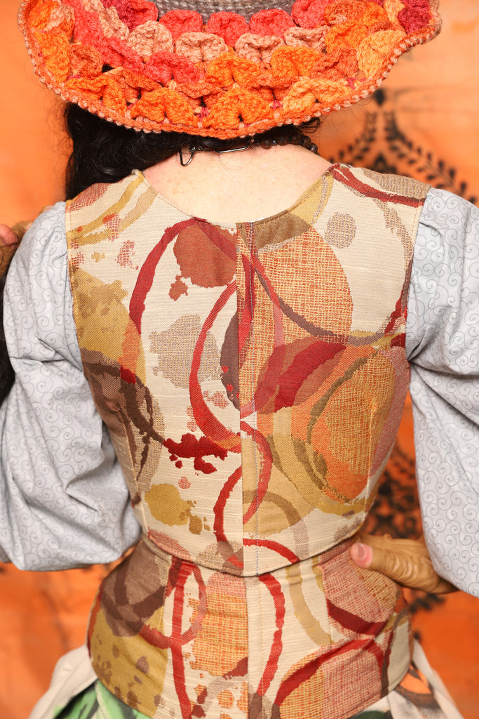 This is our shortened, vest-style version of the classic Vixen Corset, still built with sturdy metal boning for structure, but designed to sit wrapped around the rib cage for a lighter, more playful silhouette. The foldover collar adds a dash of Victorian drama or seafaring swagger—your choice!
