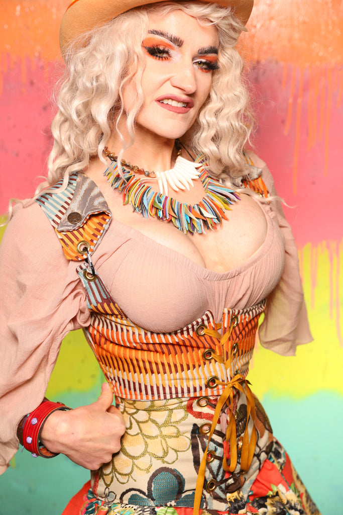This is our shortened, vest-style version of the classic Vixen Corset, still built with sturdy metal boning for structure, but designed to sit wrapped around the rib cage for a lighter, more playful silhouette. The foldover collar adds a dash of Victorian drama or seafaring swagger—your choice!