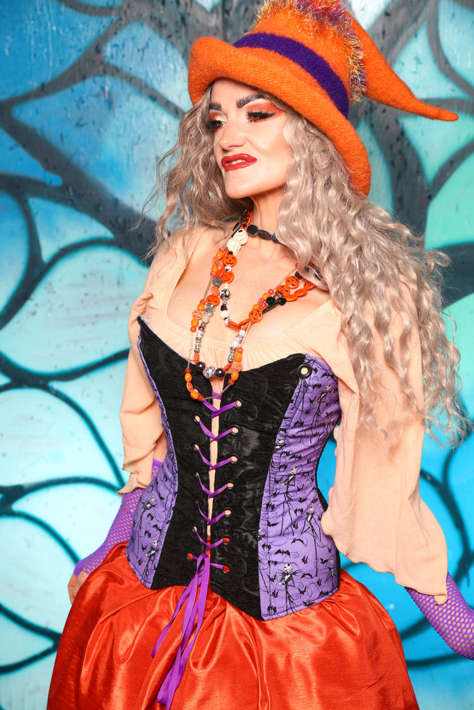 Crossfire Corset in Black Medallion w/Nightmare Before Christmas Purple Panel - The "Pumpkins, Screams & Corset Dreams" Collection