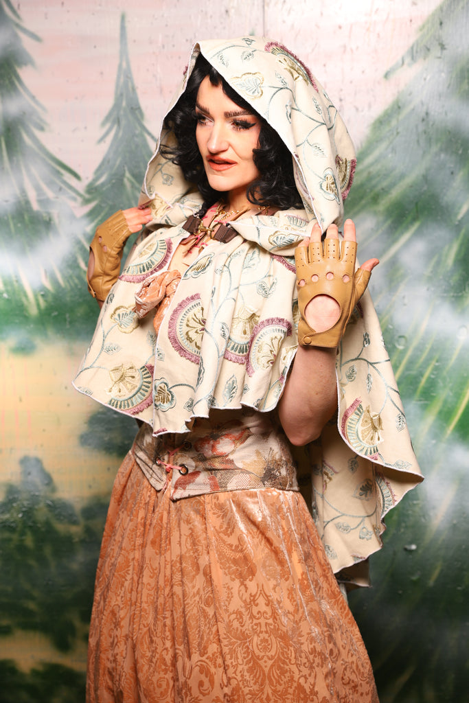 Perfect for layering over corsets, bodices, and gowns, this cloak will make you feel like you wandered out of a woodland painting and into a magical market square.