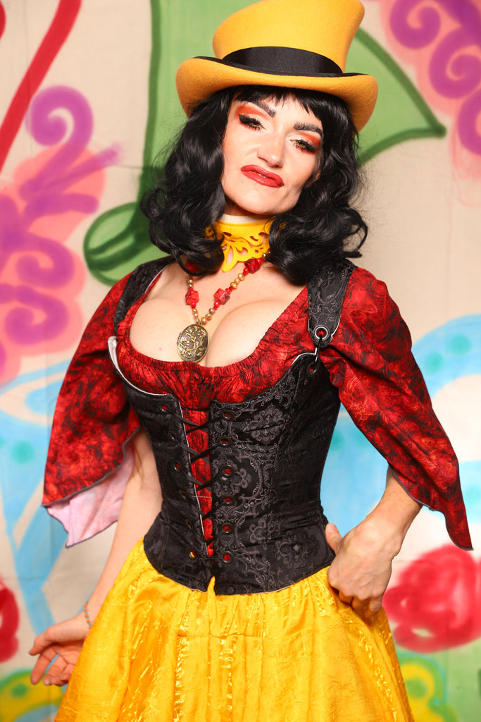 This is a very classic styled Renaissance bodice. The fiberglass rods in the front are 10" and the boning on the sides is just over 9 inches long. On me, the corset ended right below my belly button. I tried my best to still give it back support, even though it cut off so much shorter than our other corsets, so the back curves down a little bit and has 12" bones along the back casings.