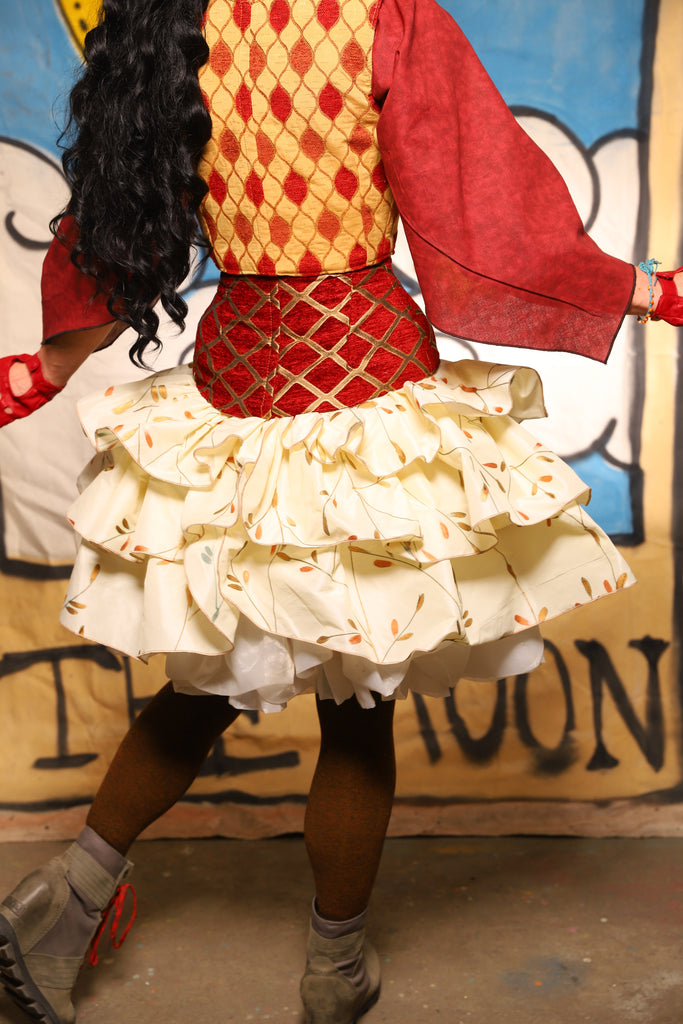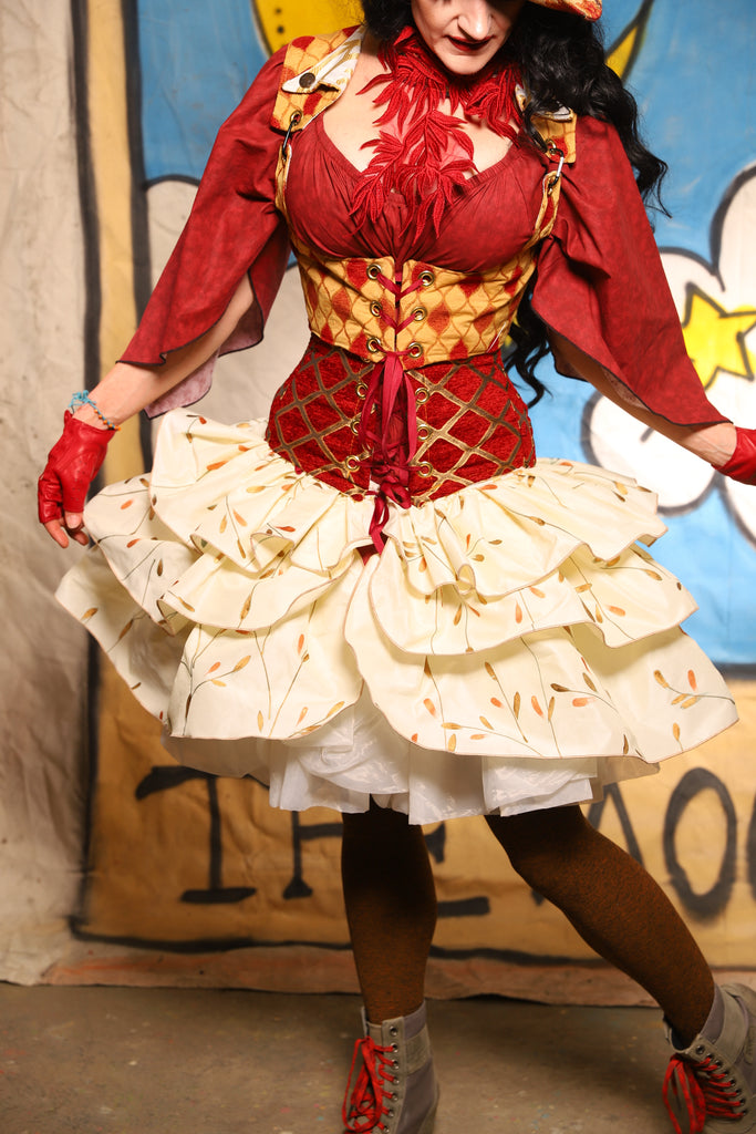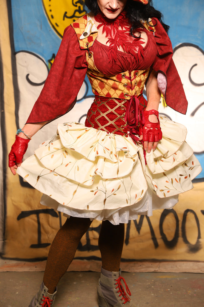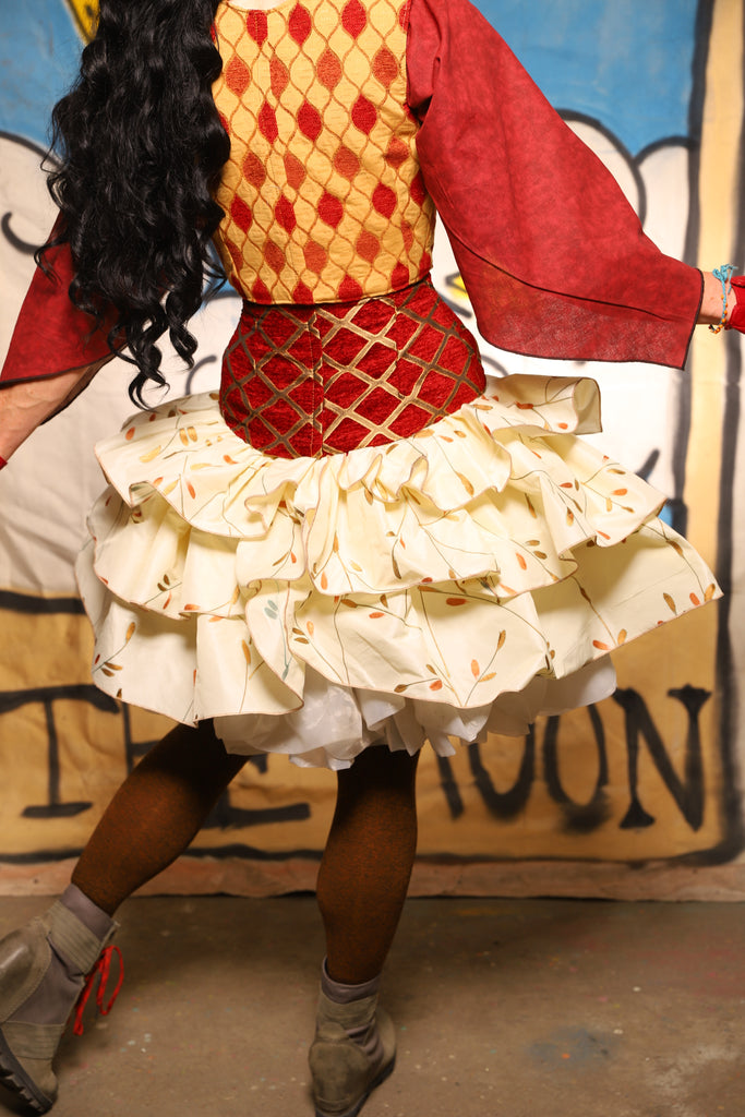 These are marvelous little sets of 3-tiered ruffles that can be added onto the back of your skirts for a fuller bustle look, or worn two at a time, for a fuller, huge ruffly tutu vibe! I carefully cut out 60" wide matching strips of fabric at different lengths, ruffle them onto a thick fabric base, and grommet them at the top corners so you can tie them together on both sides of your hips!